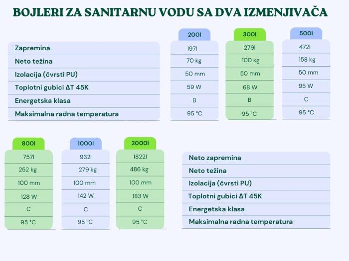 Raspon uključuje modele sa volumenom od 160 do 2000 litara sa dva izmjenjivača toplote. Prikladno za zadovoljenje zahtjeva jedne stambene zgrade ili više porodičnih kuća ili industrijskih potreba.